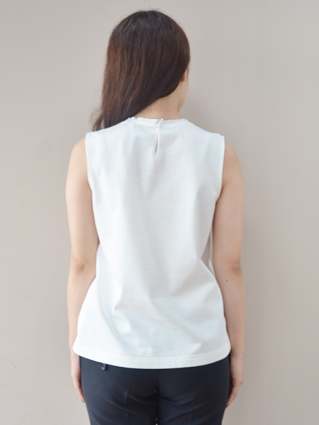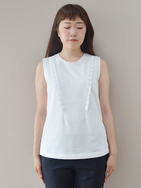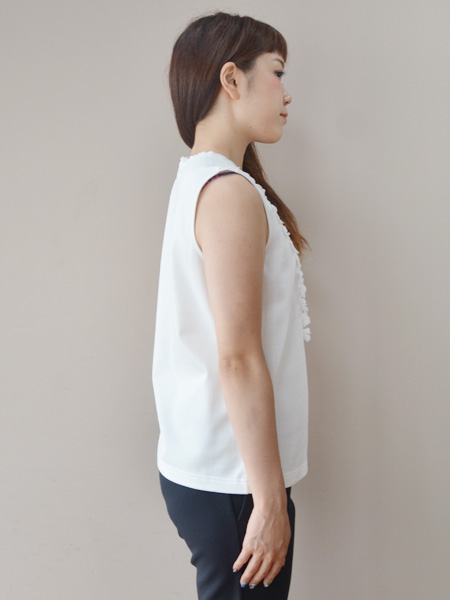 near.nipponからざっくりとしたカットソー地に、フリンジをあしらったノースリーブトップスです。ショルダーから斜めラインに走るフリンジ、上半身をすっきりと見せてくれる効果ありです。襟ぐりも程よい空きのラウンド。 カジュアルなノースリーブですが、全体的に上品な仕上がりになっています。