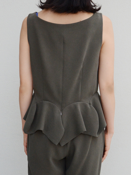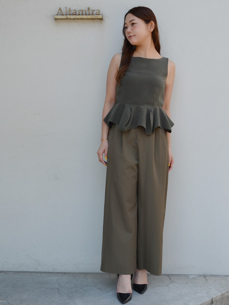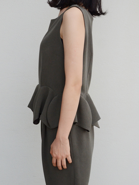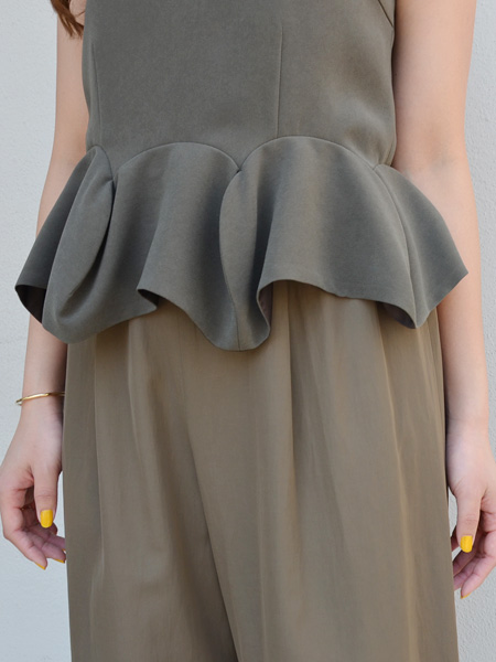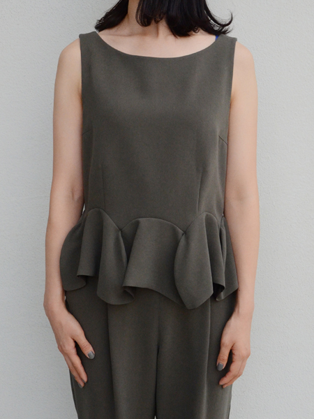 sakayori.ノースリーブペプラムトップス、同素材のタックパンツとのセットアップでの提案が今年らしい一枚。伸縮性のあるストレッチ素材で、見ていると上品なイメージ、着用するととっても楽チンなデイリーに着用いただけるアイテムです。