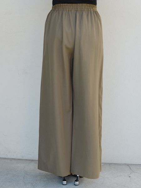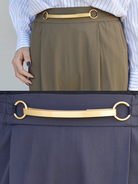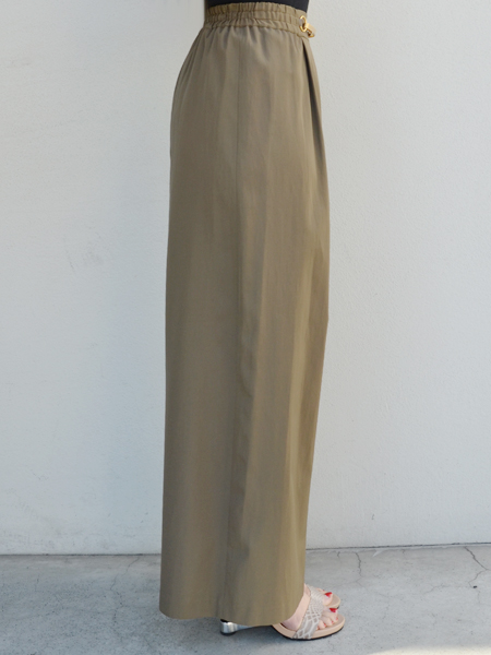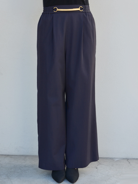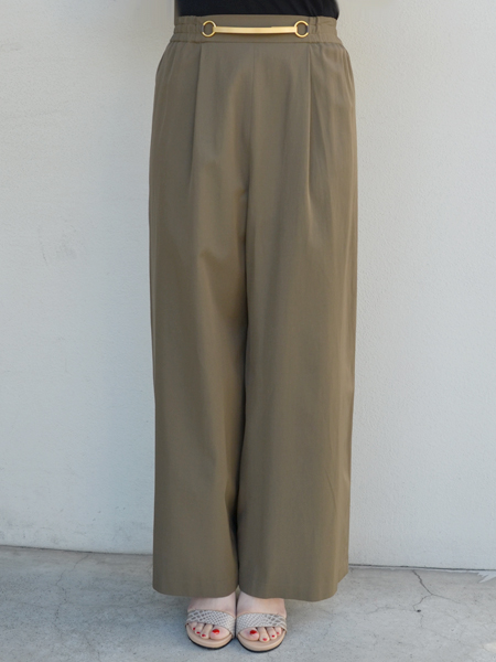 sakayori.プレート付きワイドパンツ、光沢感のあるアセテートコットン素材のワイドパンツ。薄手でさらっとした履き心地です。ウエストがゴムになっているのでとっても楽チン。履き心地はまさにイージーパンツです。ウエストのゴールドの金具がアクセントに。