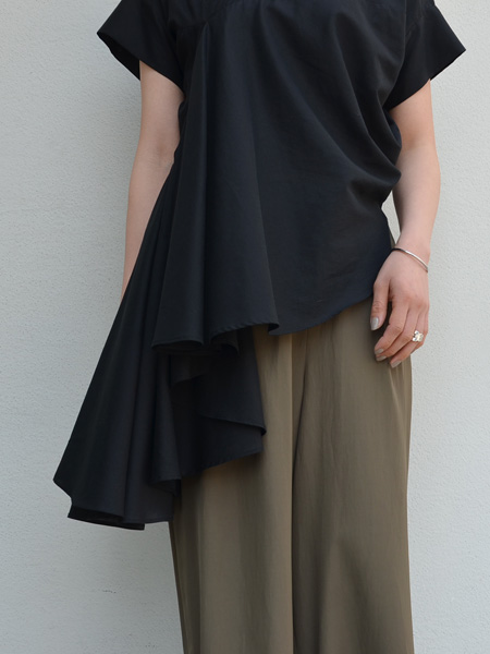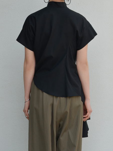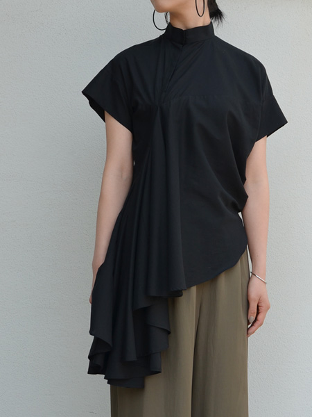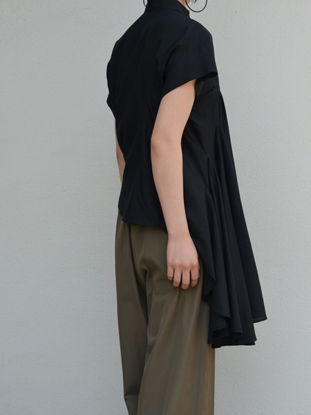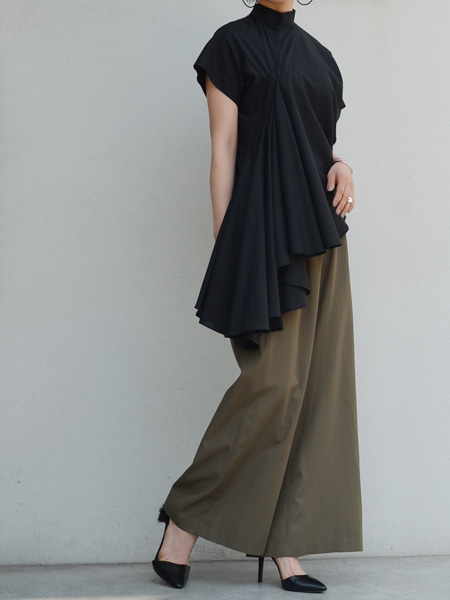 sakayori.モックネックドレープトップス、パターンが得意なブランドならではの贅沢ドレープで後ろ姿がとっても美しいトップス。モックネックにキャップスリーヴ、というデザインも今期の気分です!