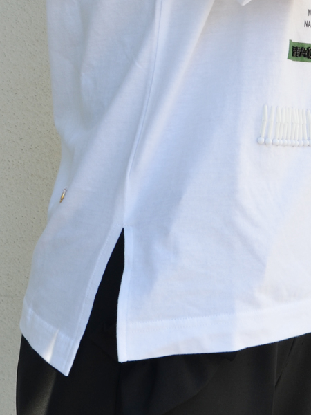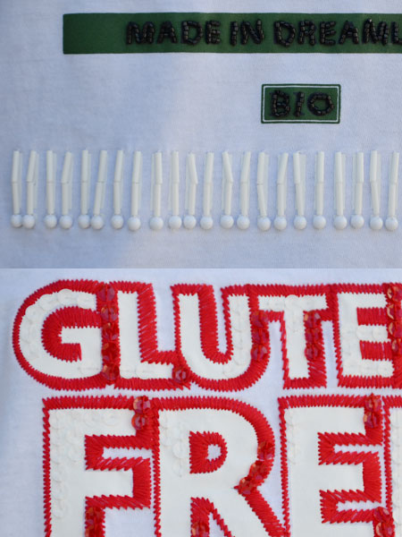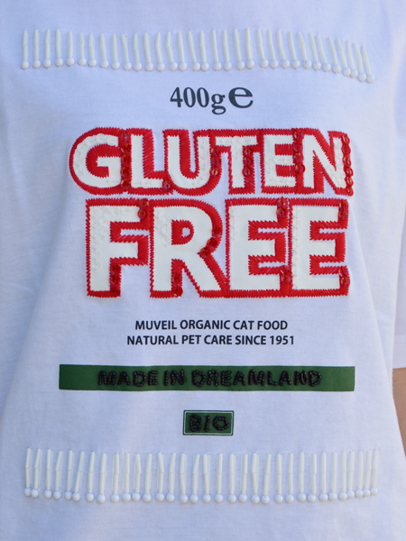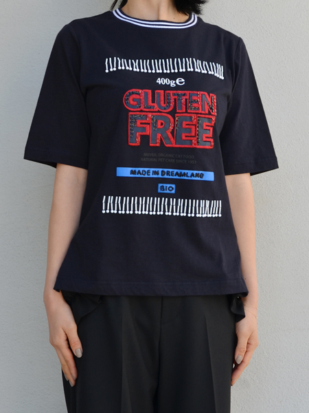 ネコ缶が刺繍されたTシャツ。ヘルシー志向の食生活を「グルテンフリー」の合言葉にのせて、表現しています。まさにキャッチーな一枚。