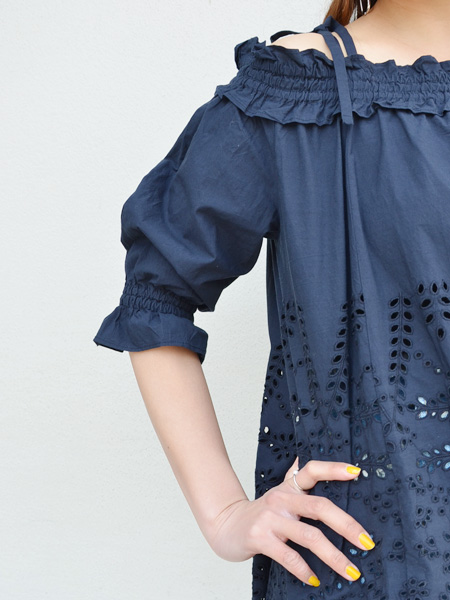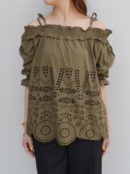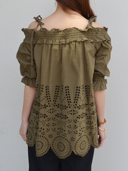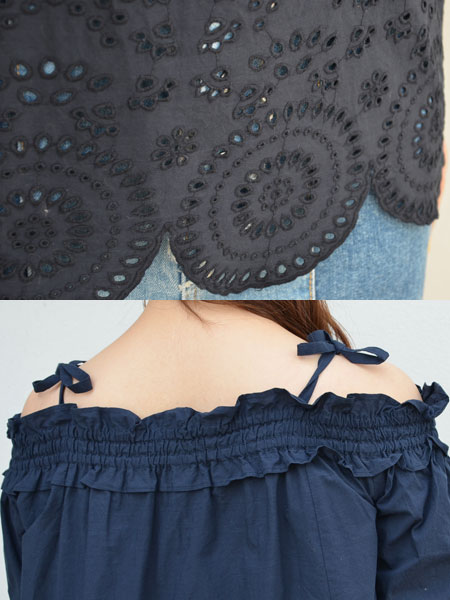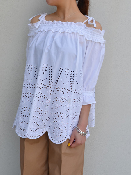 WORKラインから、シルエットが可愛い、オフショルダーチュニック!模様をカッティングして刺繍を施しており、裾がレースのような仕上上がりになっています。夏を感じる涼しげなトップスです。