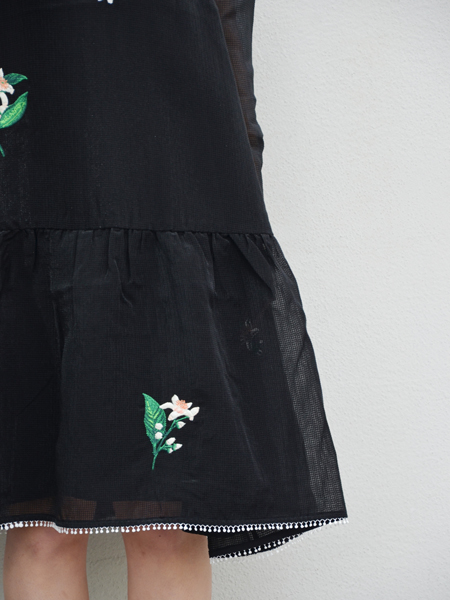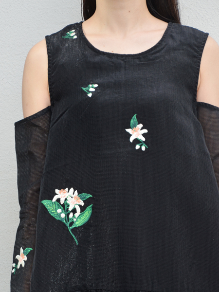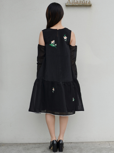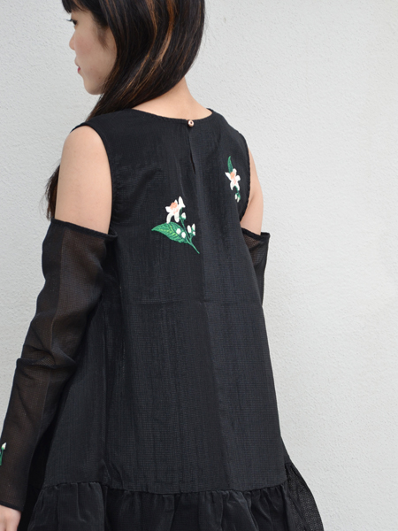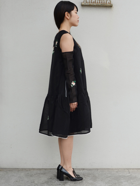 オープンショルダーになったAラインドレス。オーガンジーのような透け感のある素材で、お花の刺繍が施されています。