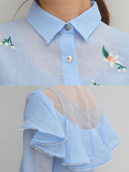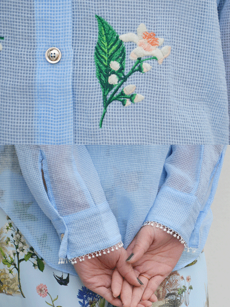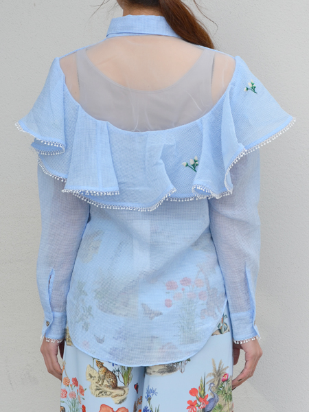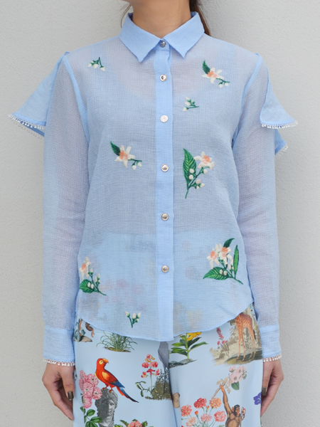 バックスタイルが印象的なシャツ。透け感のあるガーゼ素材にお花の刺繍が施され、爽やかな印象に。