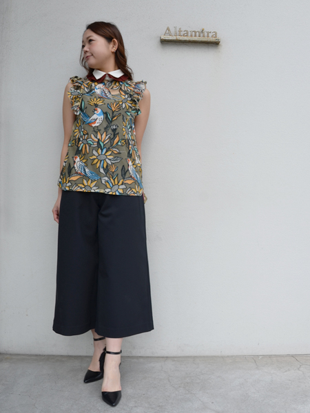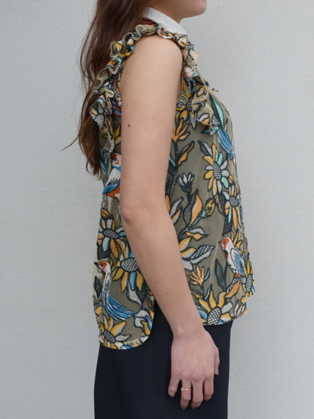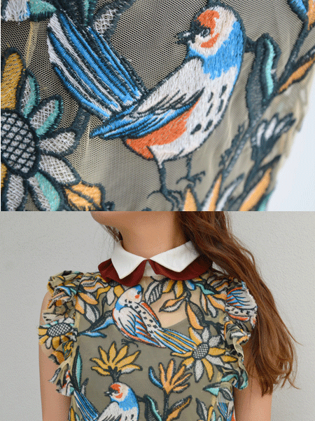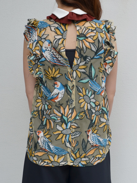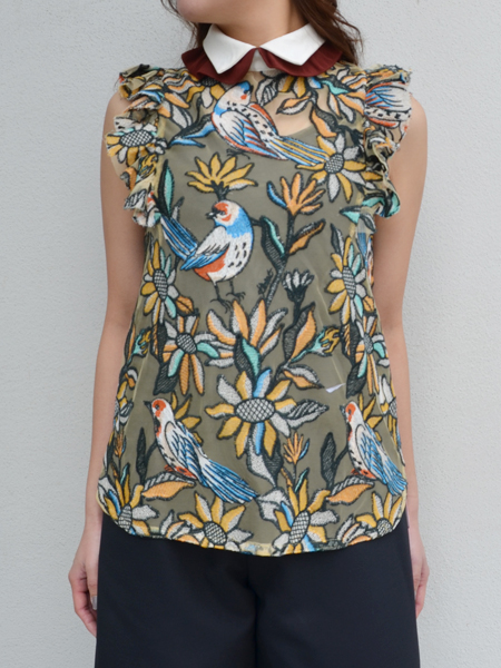 透け感のあるオーガンジーに鳥とお花が刺繍された総刺繍のノースリーブトップス。襟もフリルと2段になっていて、手の込んだ一枚。