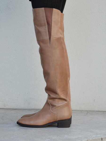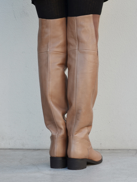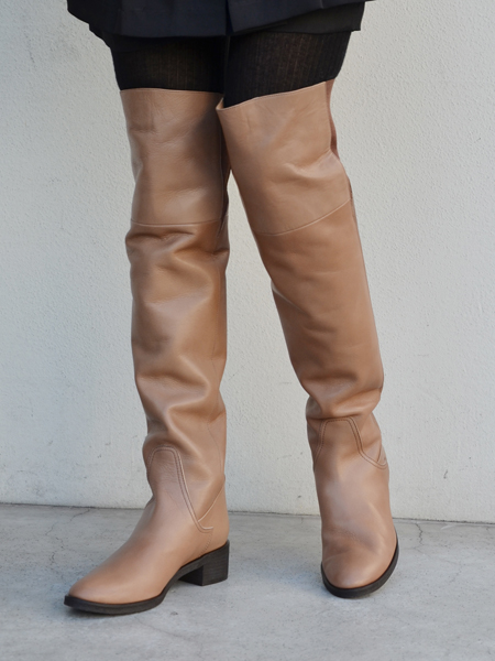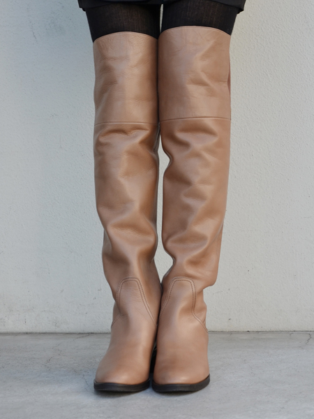 シンプルな定番のニーハイブーツ。太ももまですっぽり入る長めのシルエットが特徴です。カウレザーを使用しており、はき心地の良い一足です。