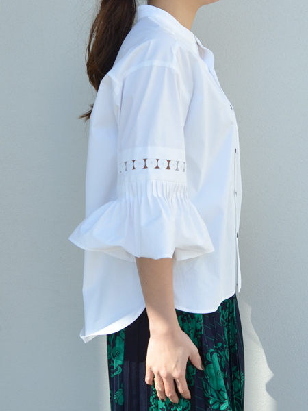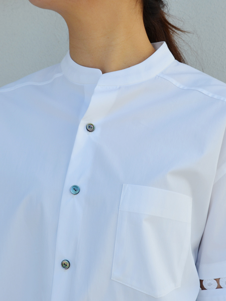 ストンとした身ごろのボックスシルエットと袖口にかけてのボリューム感が特徴。東レの UVカット ブロード という生地を使用、透け防止の糸を使用した生地で、UV対策と吸放湿性に優れ、さらっとして柔らかい肌触りも特徴の一つです。
