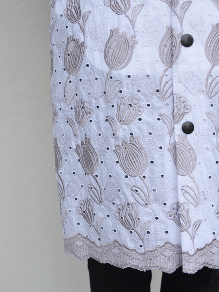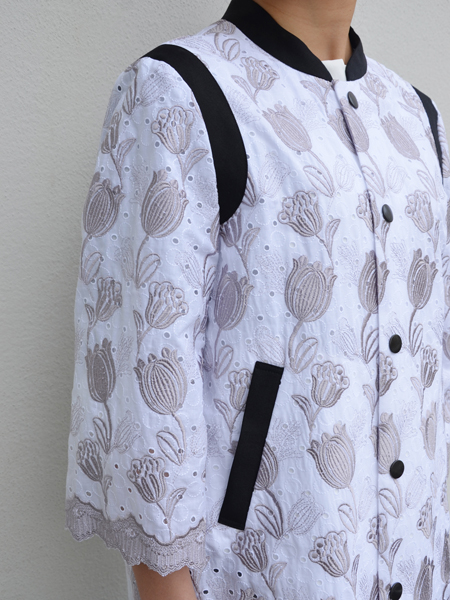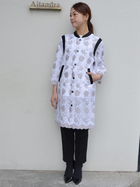 near.nippon(ニアーニッポン)から、全面に刺繍生地を使用した、贅沢なロングブルゾンコート。マニッシュなブルゾンをラグジュアリーな生地で作った遊び心のあるアイテムです。 コットンベースなので、軽く涼しく、春らしい一枚。 QUALITY: 表地/ COTTON 100% レース裏チュール/ NYLON100% 刺繍糸 / RAYON100% COLOR: WHITE SIZE:FREE