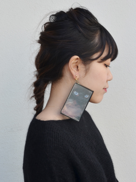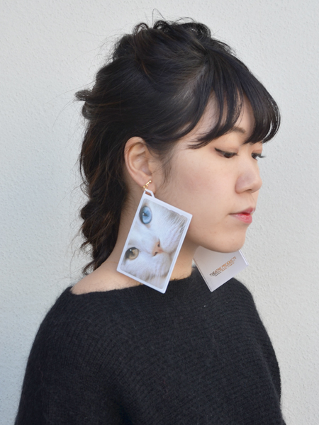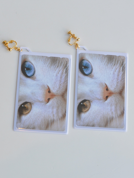 テレフォンカードをモチーフにしたイヤリング。ネコちゃんのプリントが目をひくアイテムです。PVC(塩化ビニール)素材なので軽量でつけやすく、個性的な耳元を演出してくれます。