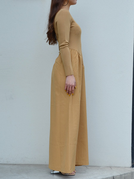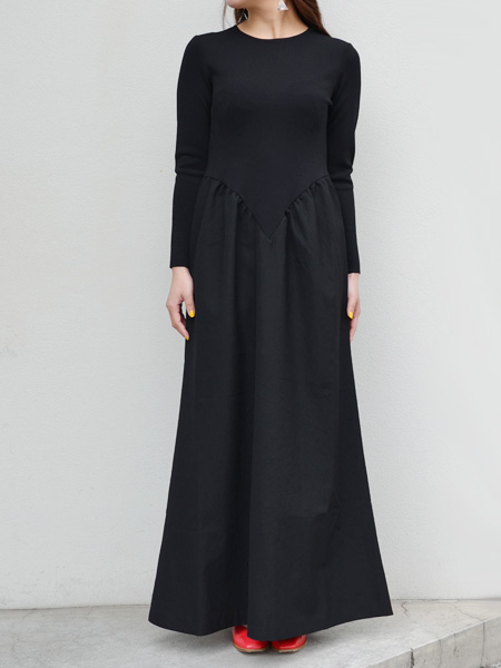 細身のトップ部分からVに切り替えられたウエストライン、タックを入れて広がるロングスカートのシルエット。シンプルで上品なマキシドレスは素材の切り替えでカジュアルな印象。