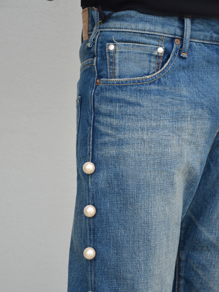 生地の色落ち感のあるこなれた風合いと、パールのしっとりとした艶めきとのコンビネーションがユニーク。