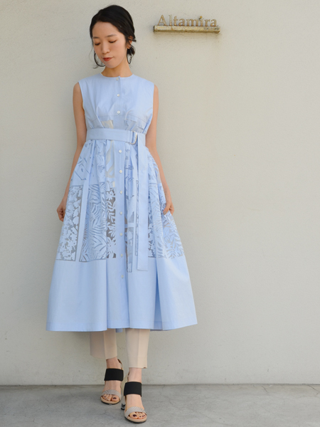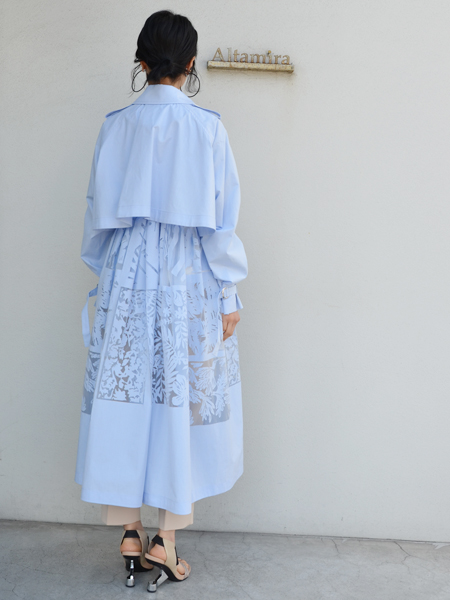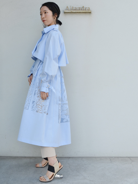 コットン素材のスプリングトレンチコートはsakayori.らしい嬉しい工夫が。ボタンを外せばなんとショートトレンチとノースリーブワンピースにセパレートできてしまう優れもの。こちらの生地はオパール加工と言ってコットン糸とポリエステルの透明な糸を使った生地に特殊な液をかけてコットン地を溶かすことで繊細な模様を作っています。今季のテーマであるインドシアにちなんだトロピカルな模様が透けて表現されています。3つの着こなしができるこちらのコート、オススメです!