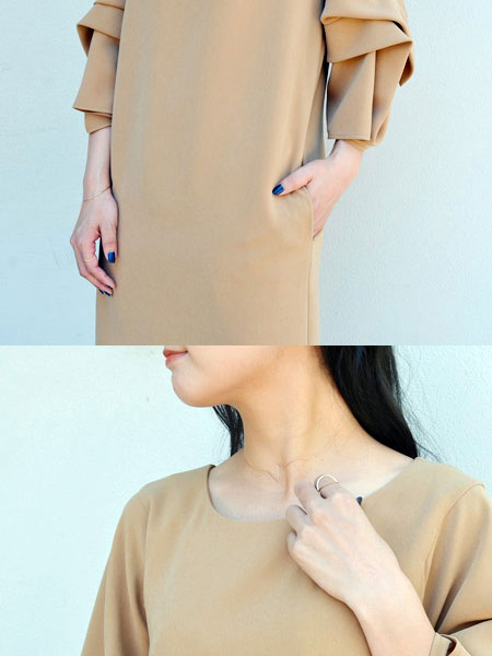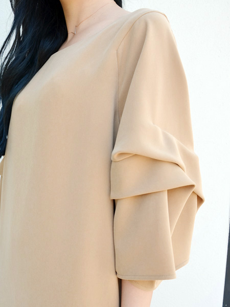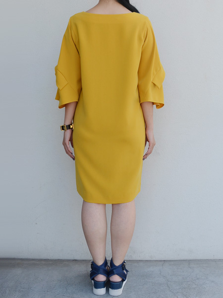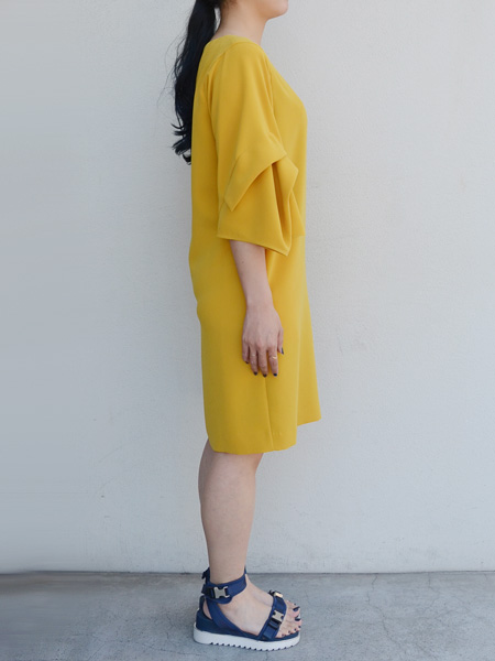 ドレープの効いた7分袖が特徴のワンピース。ほどよく空いた襟ぐりとストンと落ちるストレートラインがカジュアルな印象に。パンツを合わせて普段着にしたり、アクセサリーを加えて2次会などのカジュアルなパーティーにも良いですね。アセテートとポリエステルのダブルクロス素材で光沢とハリ感があります。