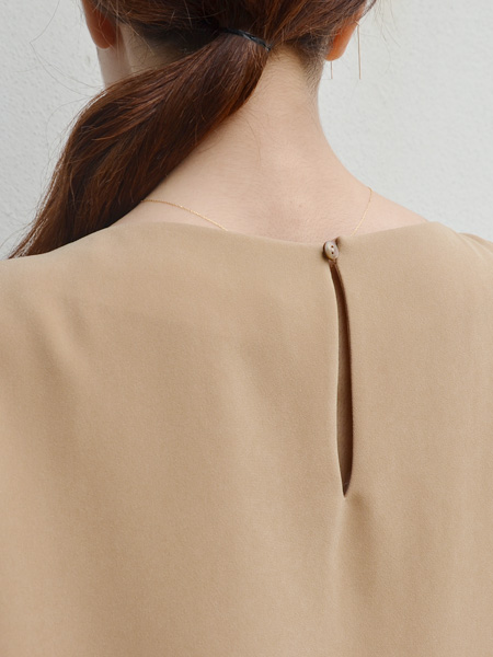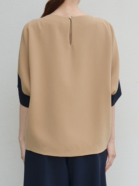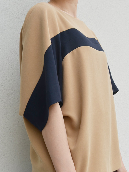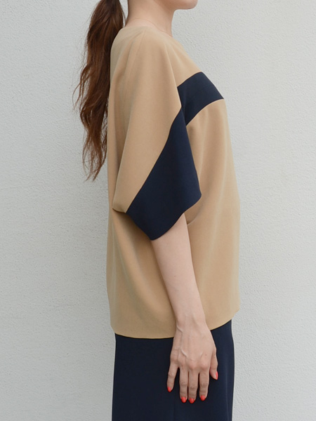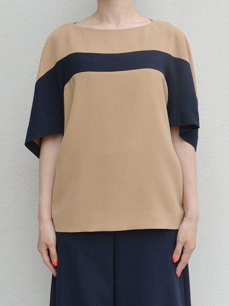 同素材の生地を色で切り替えたトップス。ほどよく空いた襟ぐりに5部袖のデザインで、リラックススタイルにはぴったりのトップスです。同素材のパンツとのセットアップスタイルもオススメ。アセテートとポリエステルのダブルクロス素材で光沢とハリ感があり、高級感のある一枚です。