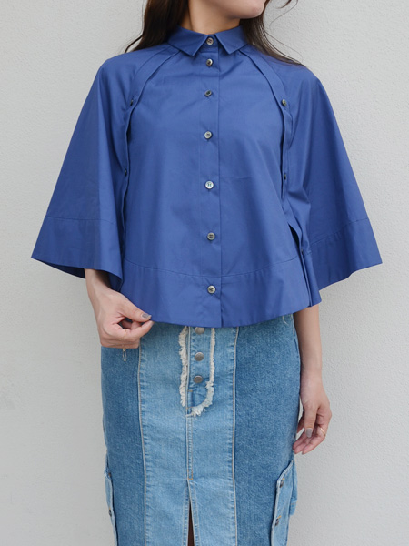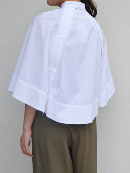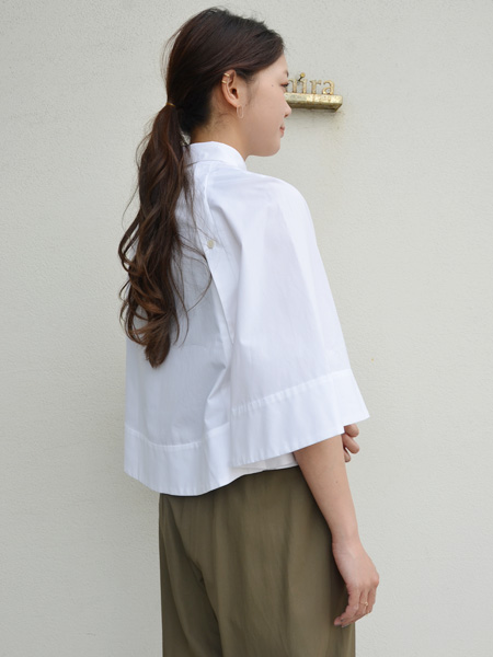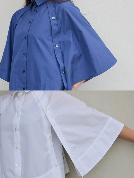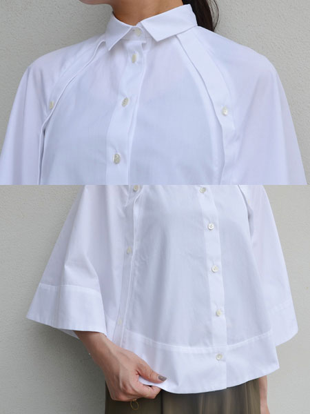 ベーシックなケープシャツはsakayori.らしい工夫のある一枚。ボタンを外すとベルスリーブのシャツとして着用できるのでアウターにも困らない嬉しい仕様です。綿ブロードというシャツとしてはベーシックな素材を採用していますので、いろんなシーンに活躍しそうな一枚です。