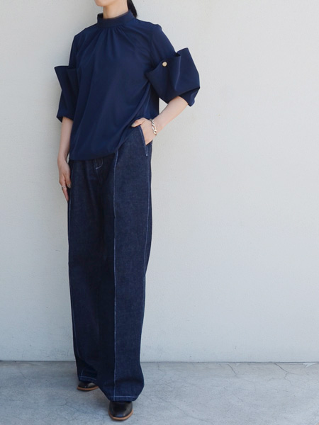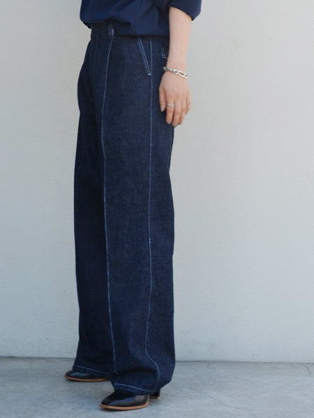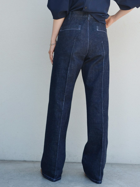 AKIRANAKA初の生デニム。デニム生地でテイラードのパンツを再現した一本。センタープレスをステッチで表現しています。