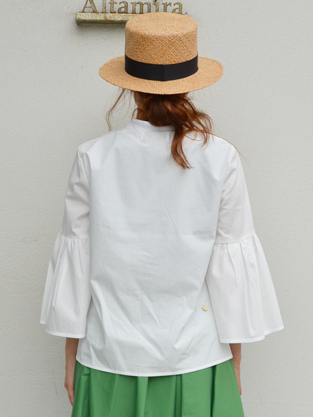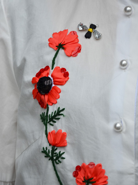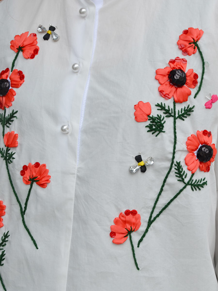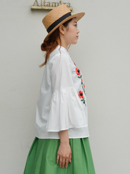 スタンドカラーで涼しげなプルオーバーシャツは、アネモネのお花刺繍がアクセントに。