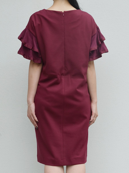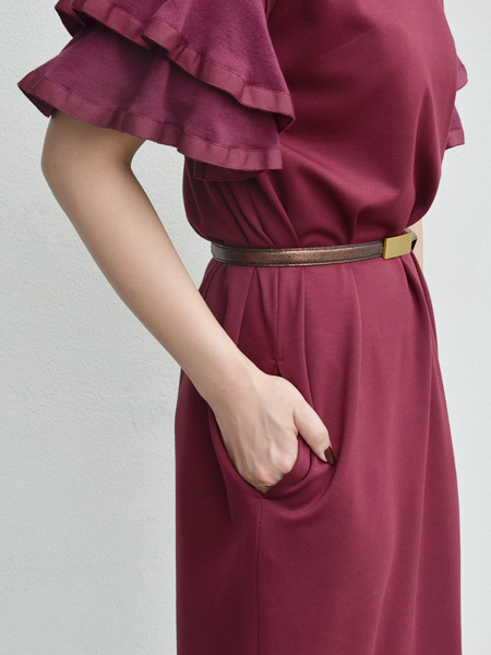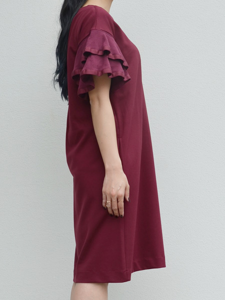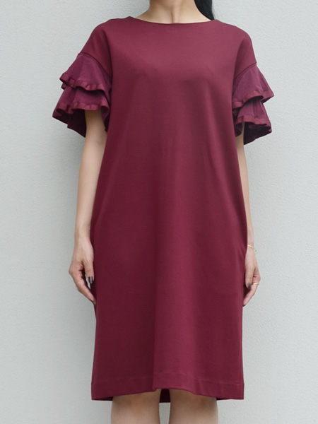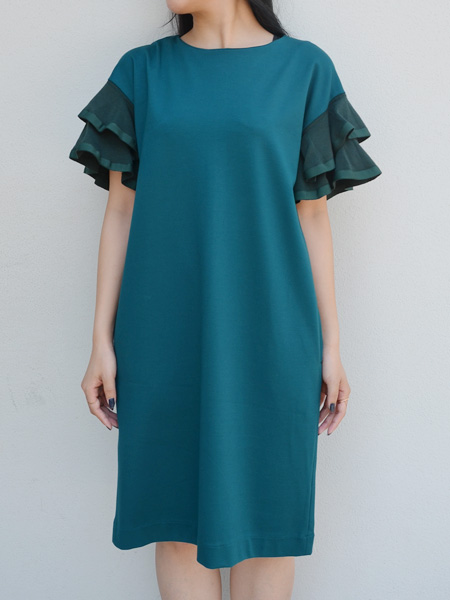 さらりとした落ち感のるカットソー生地のゆったりワンピースにニット地のフリル袖が付いたワンピース。一枚で着てリラックススタイルでも女性らしさを感じることのできるアイテム。