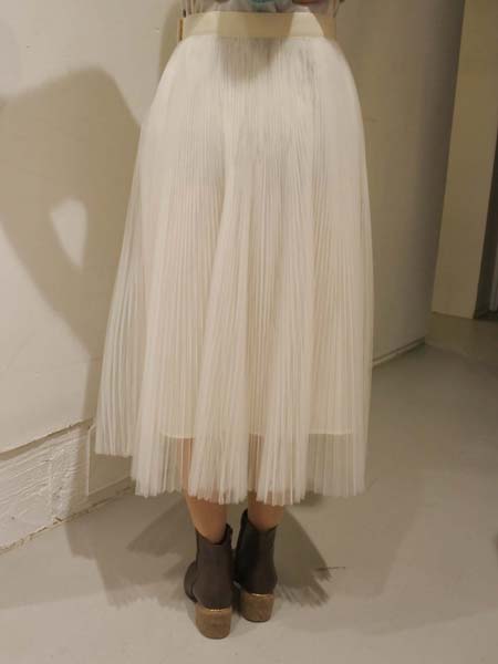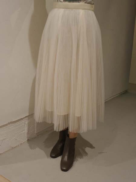 コレクションラインでもたくさん登場したチュール、ワークラインでは削ぎ落とされたデザインに手に取りやすい価格でリリースされました。 細かなアコーディオンプリーツのスカート。