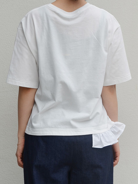 2段のレースがポイントのTシャツ。コットン素材のやわらかなボディーにコットンのフリルがフェミニン。一枚で着用しても貧相に見えず、シンプル過ぎないシンプルなトップス。