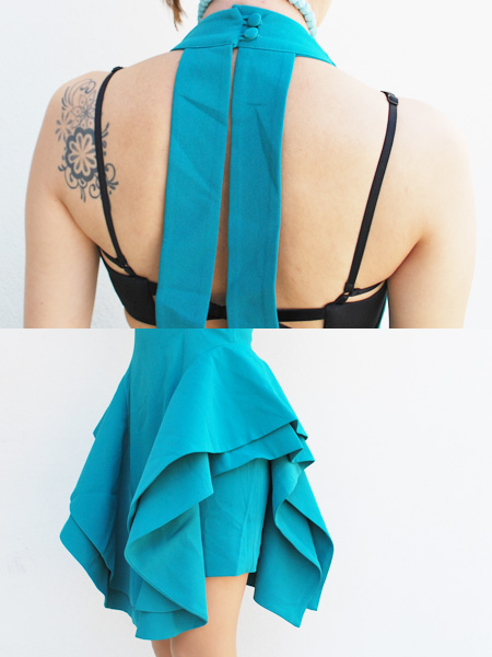 シンプルなカラーリングに、レイヤードしている部分がドレープした作り込まれたワンピース。 無地のグリーンが上品で、結婚式などのパーティーシーンにも活躍してくれます!! 露出も多いですが、嫌味がなく、インポートブランドらしいデザインのワンピースです。