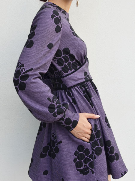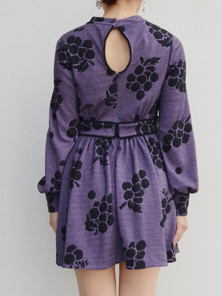 ぶどう柄の長袖ワンピース。ハイウエストの切替で締まって見えるので、女性らしいシルエットに。左右ポケット付きです。