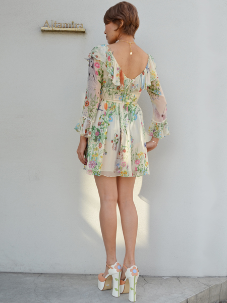 シフォンロングスリーブドレス。カラフルなお花やイチゴ、鳥やウサギなどの動物達がプリントされたオリジナル生地が目をひく一枚です。フリルがたっぷりあしらわれた襟ぐりや、ベルスリーブのお袖は、動く度にふわっと揺れてとても可愛い